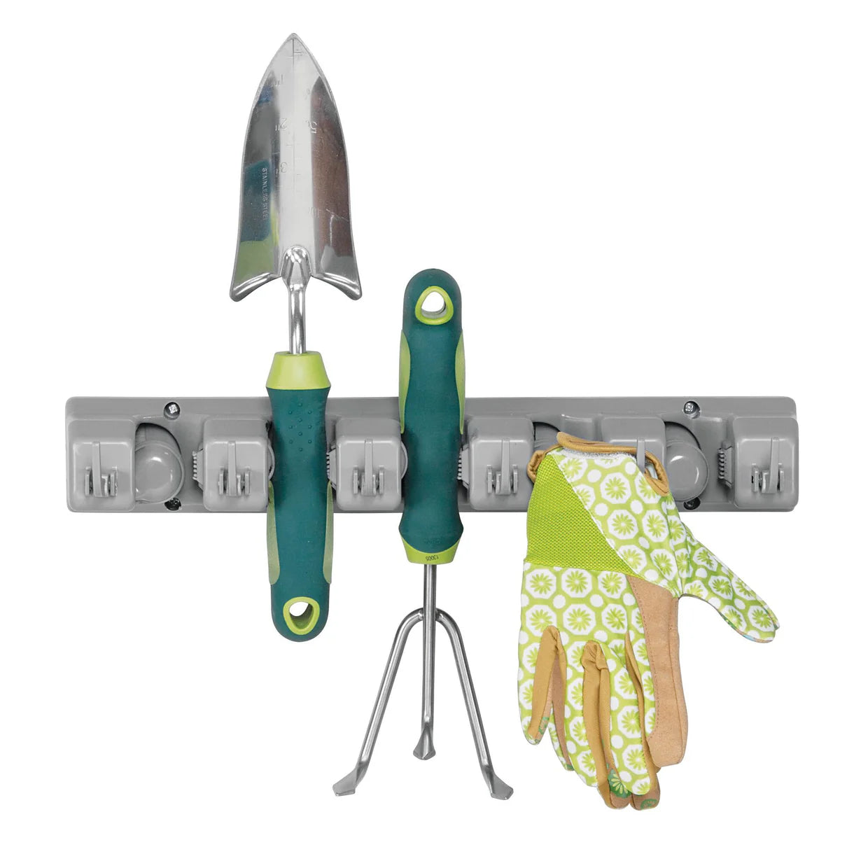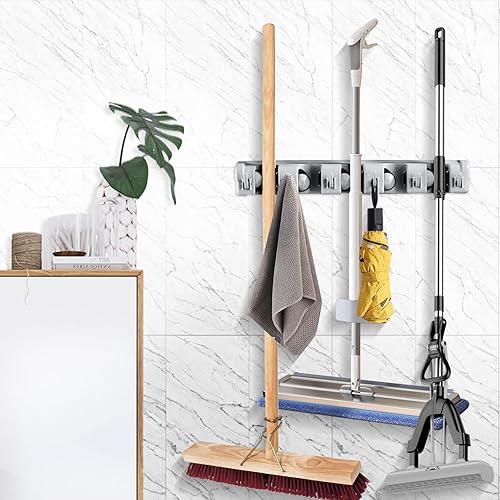 5 agarraderas de alta resistencia para escobas, rastrillos o trapeadores, 6 ganchos para paños u otras herramientas, diseño compacto, elegante y multifuncional.