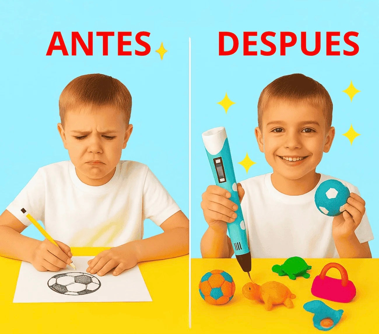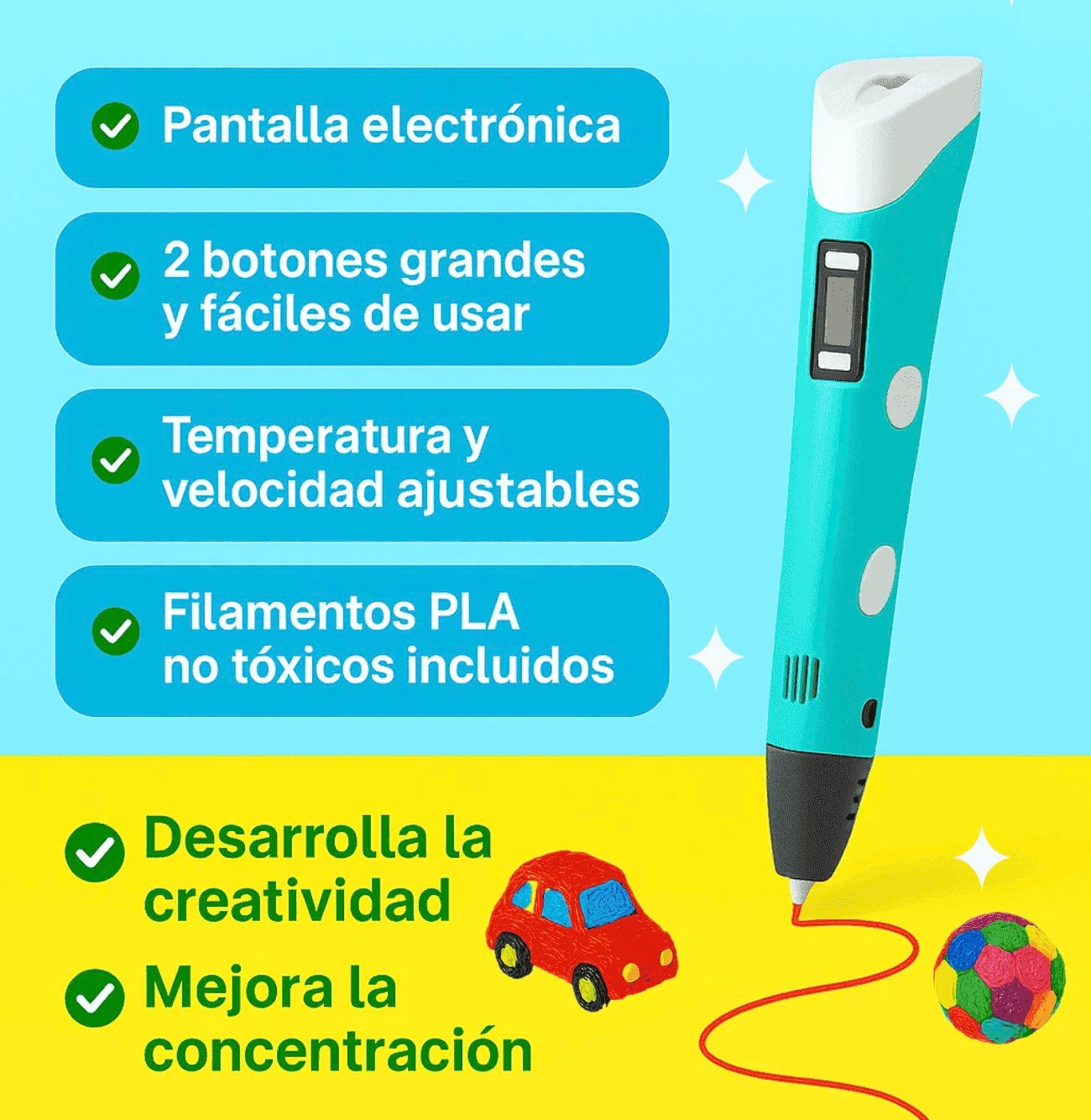 - 🚀 Crea ¡Mira la magia! El plástico se endurece al instante. Dibuja sobre papel o directamente en el aire y ve cómo tus ideas cobran vida.
